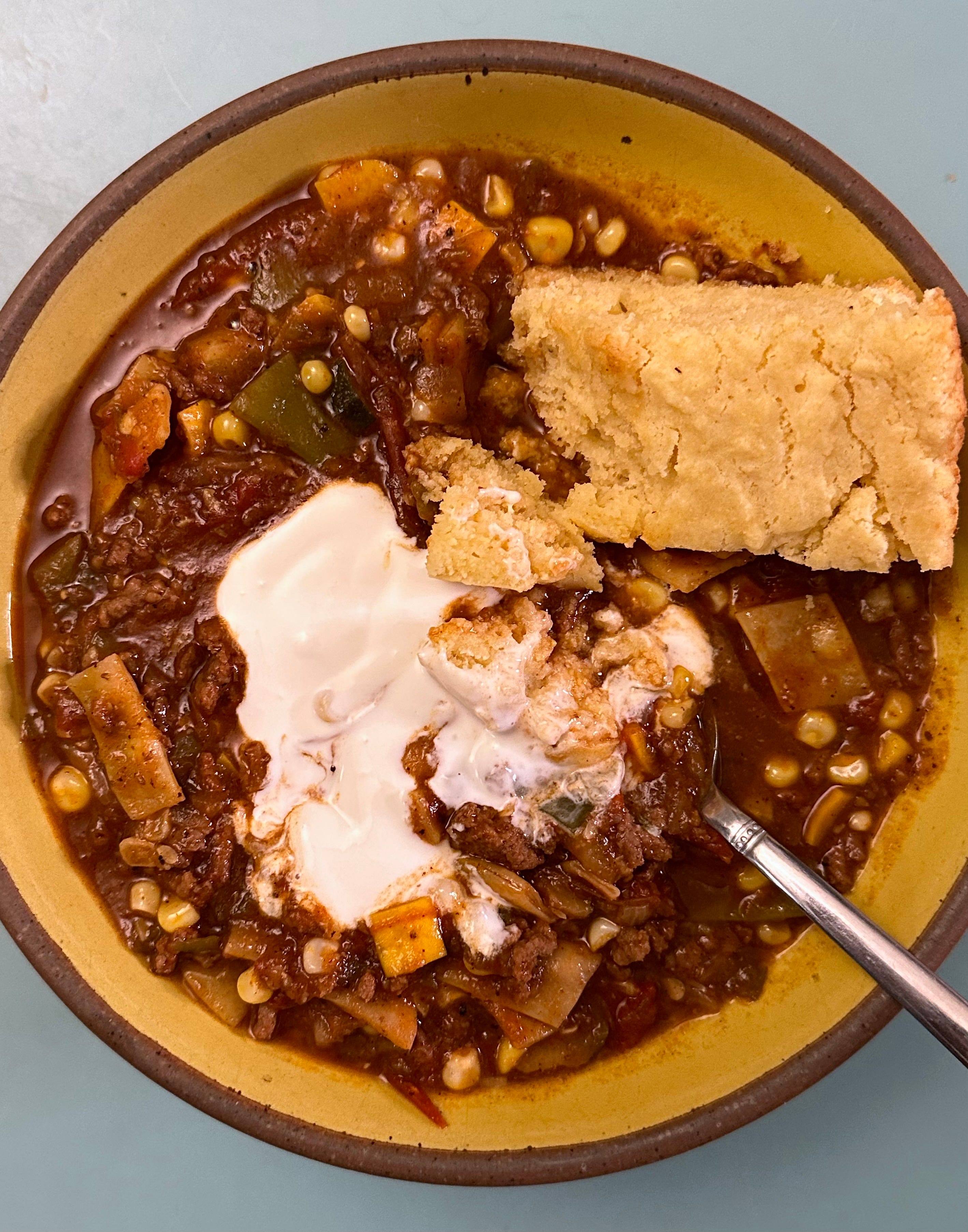 Real chili, the kind I envision cowboys simmered over open flames, with secret recipes earning blue ribbons, is all about the meat. Hunks of various cuts of meat stew for forever with spices, pureed dried chilis, aromatics, and maybe tomatoes until it all falls apart into a rich gravy. Die-hard chili heads balk at adding beans or using ground meat, so they will most certainly hate this summer chili. Look away, chili purists. This baby is more vegetables than anything else. Yes, it breaks all the rules by starting things off with ground meat, then uses generic chili powder instead of whole dried chilies, and as a final smack in the face, packs the whole damn farmers market into the pot. But it’s chili in its heart, I swear. And I think, exactly what you want to eat in this heat wave. For this recipe, I drew some inspiration from loubieh bi zeit, a green bean stew Ham makes on repeat in the summer. The beans are cooked down until they fully melt into silky bites, which he serves as part of a mezze spread or as a side with grilled meat. It’s totally turned me around on fresh beans, which were never a summer vegetable I clamored for. If you run into us at the farmers market and see Ham packing a tote full of beans, that’s why. Rather than getting its richness from meat, this chili takes a note from loubieh bi zeit, relying instead on the luscious texture of long simmered fresh beans. Use any kind you can get your hands on, like romano beans, wax beans, or string beans. But if all you can find are your standard green beans, they will work here just as well. The fussiest part of this recipe is all the knife work, but a lot of it can happen while the meat browns, unless you’re not so confident in your chopping skills. In that case, I recommend you prep all your veggies before you get cooking so you can focus on the cooking part. This chili only tastes better as it sits, so it’s a great dish to prep on Sunday and eat all week. You’ve got a lot of downtime while the whole pot simmers together, so I use that time to whip up a quick cornbread to serve alongside. Try this super easy recipe by King Arthur if you want to round out the meal. They also offer ways to jazz it up with bacon and cheese if you want to level things up. Summer Chili With All The Veggiesserves 6 to 8 | active time: 30 minutes | total time: 1 ½ hours INGREDIENTS