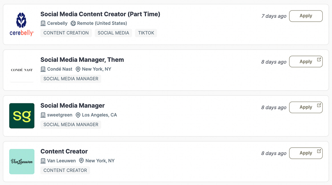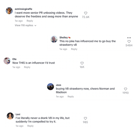 Thank you for subscribing to Link in Bio! You can always upgrade to a paid subscription here. This newsletter is an educational resource and can likely be expensed through your company—I have even written a template for you to use when asking! For subscription details, see my About page or your account page. You can reply to this email. How Brands Are Responding to the TikTok BanHow The Washington Post, sweetgreen, Topicals, Duolingo, Morning Brew, and more are handling the ban.Last week my For You Page served me the most wholesome unboxing video I had ever seen. It was documented on Madison Taylor’s account and featured her 92-year-old grandpa Norman unboxing a package from V8 Juice. The video is currently at 5.4M views. I needed to know the story behind this unconventional unboxing video, so I chatted with the V8 Juice social team. They told me the story actually started back in December, when Madison posted her grandpa’s “daily agenda” which included V8 original and V8 +Energy. They saw that video through social listening (it only has 11K views, so that’s pretty impressive) and commented as a brand but didn’t engage much further. Then, on April 15th, Madison DM’d V8 Juice to ask if they could send a package to her grandfather to cheer him up after a loss in his family. “We of course obliged and sent a package and handwritten note on April 18th—this is pretty standard for us across all our brands when we identify a unique brand fan moment or opportunity to surprise and delight,” the V8 Juice team told me. Then Madison posted the unboxing and it took off. “Our team truly wanted to gift a care package to a fan and did not plan for any virality or expect an unboxing since we know those are never guaranteed and, truly, a man in his 90s is not the target audience for our social content.” The V8 Juice team shared the viral video with their team that Monday morning and quickly contacted Madison to see if they could respond to the video in some way. In their communications they realized Norman lived in Philadelphia—”our initial package was sent to Florida, we didn’t know he was a snow bird”—and that he was mere blocks away from members of the V8 Juice social media team. They invited him in to meet IRL. The video of that interaction has over 500k views. As anyone who reads this newsletter knows, I think brands that lean into their core customer and universal truth tend to perform better on social. When you position yourself on social media in a way that’s so far from the truth of how people engage with your product IRL, it becomes disingenuous. The V8 Juice team tells me, “Norman more accurately represents our V8 original core audience—the fact that he is also a V8 +Energy fan is unique since there isn’t a lot of overlap in those consumers. Internally, we’ve needed to educate why we are even leaning into a 92-year-old man drinking our product, but for those of us subscribed to your newsletter, we know how following the wave of virality is important for being relevant on the platform. V8 has truly won the hearts of Madison’s millennial/Gen Z audience and as a result, we’ve received an 11% increase in our followers on V8 TikTok. Additionally, many younger commenters speak about purchasing V8+Energy for the first time.” The V8 Juice team knows this type of viral content isn’t necessarily replicable. They tell me, “We feel this is where social listening comes in—you can’t manufacture this type of authenticity. If anything, this type of viral moment has reinforced the need to be ready when it happens and prepared to act on your feet.” As for what’s next for Norman and V8 Juice? “Stay tuned—we are working on planning Madison and Norman’s visit to our HQ as promised.” The Link in Bio Job BoardThere are some great new job postings on the Link in Bio Job Board! The Philadelphia Eagles are hiring a Social Media Manager. There are also new roles from sweetgreen, Califia Farms, Away, and Netflix. How Brands Are Responding to the TikTok BanI spoke with social leads at places like sweetgreen, Morning Brew, Duolingo, the Washington Post Universe, Topicals, and more all about their plans now that the TikTok bill has been signed... ![]() Continue reading this post for free, courtesy of Rachel Karten.A subscription gets you: