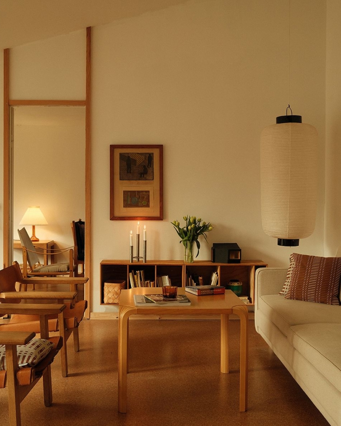 Architect Pil Kallesø lives with her family in one of Jørn Utzon's iconic Kingo Houses in Denmark. The couple's love for Nordic architecture runs deep. Their serene home, filled with Artek furniture and Johanna Gullichsen textiles, reflects that shared passion.